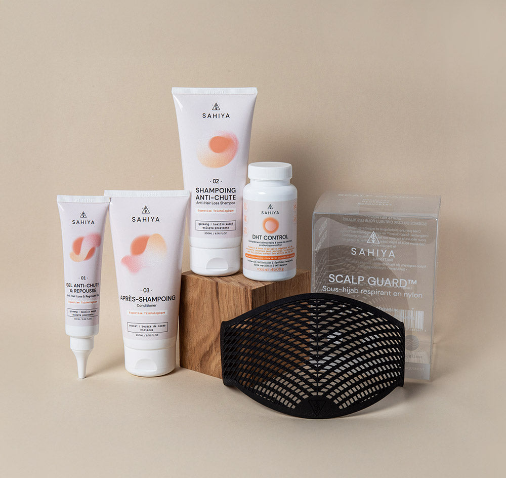 Le pack Hijab anti-chute et repousse Sahiya vous accompagne pas à pas avec le Scalp Guard respirant + routine anti-chute experte